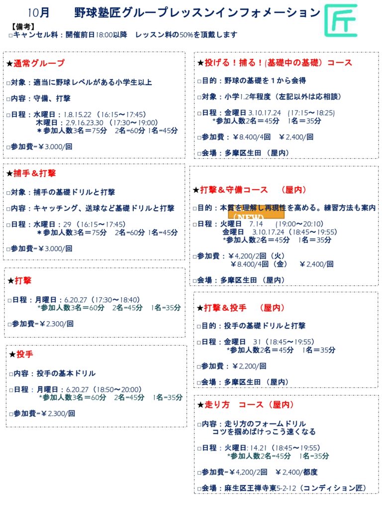 【10月グループレッスンのご案内】 2025年9月20日 最終更新日時 : 2025年9月20日 takumi 追加レッスンです。 金曜日に好評いただいている屋内開催の「守備&打撃」を火曜日19:00~追加しました。参加状況によっては実施回数を増やす予定です。
